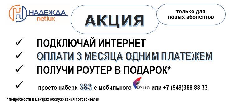 Акция действует с 11.08.2025 г. и до момента окончания Wi-Fi роутеров на складе ОператораАкция доступна только для новых абонентов услуги Интернет.